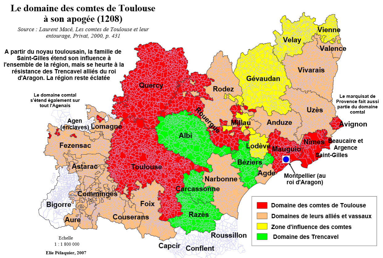 Ainsi, au XIIe siècle (et nous résumons à grands traits) nous sommes ici dans les terres d'un comté nommé "Razés"*, dans une principauté assez autonome dominée par les Vicomtes de Béziers-Albi-Carcassonne : les Trencavel*, dont les terres sont à la jonction de deux entités comtales de premier ordre : les comtés de Toulouse au nord-ouest, le comté de Barcelone (puis Royaume d'Aragon) au sud.