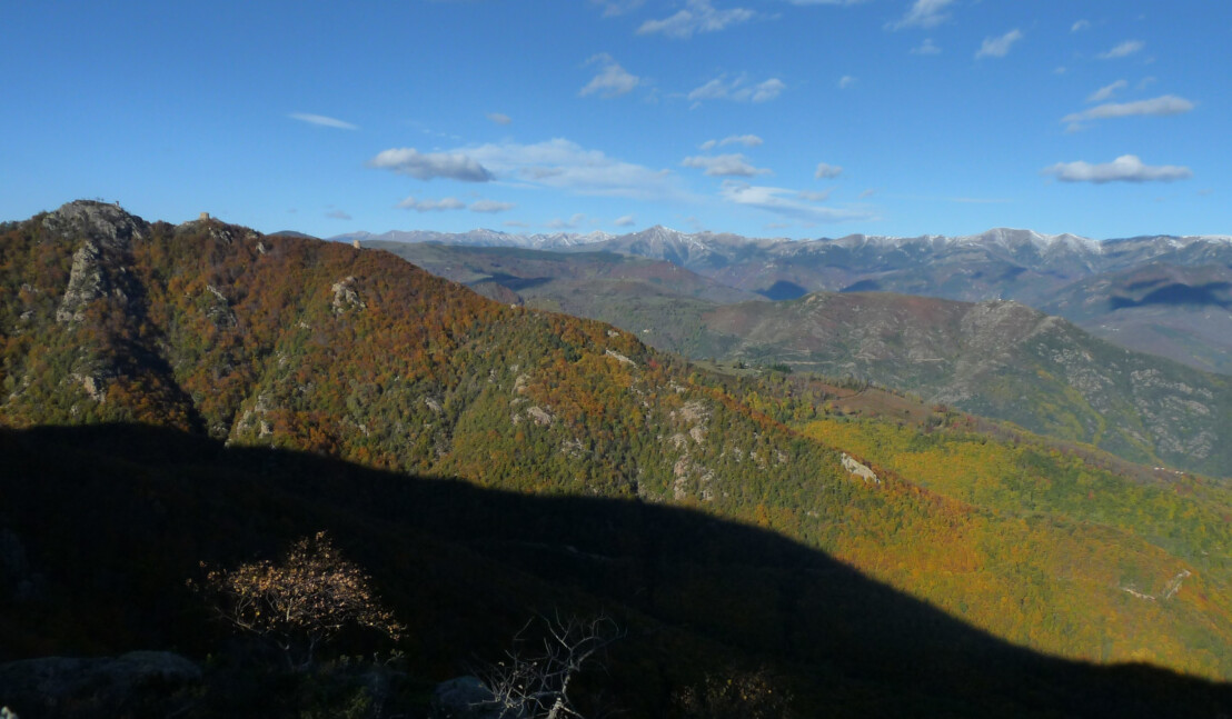 Vue générale sur le Haut-Vallespir avec les 3 tours de Cabrenç sur la gauche.