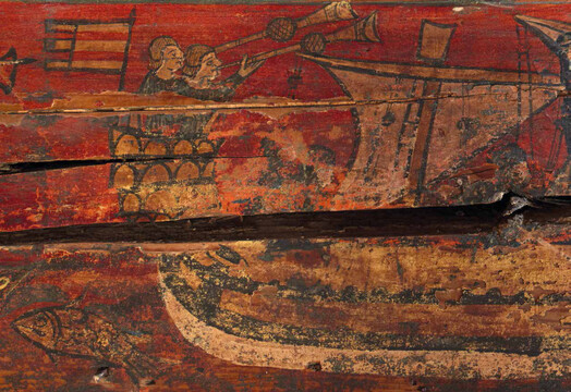 Plafond peint sur le sujet, issu d'une maison de Montpellier. Sonneurs de buisine sur le château arrière du bateau se dirigeant vers Majorque. Détail de la poutre maitresse.