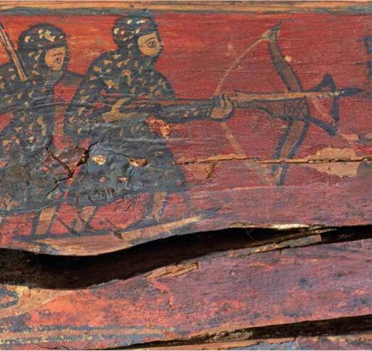 Plafond peint sur le sujet, issu d'une maison de Montpellier. Détail, arbalétrier prêt à l'assaut, sur la proue d'une galère, lors du débarquement.