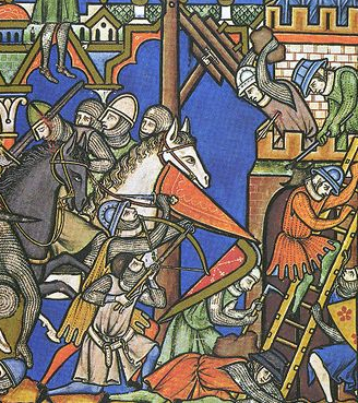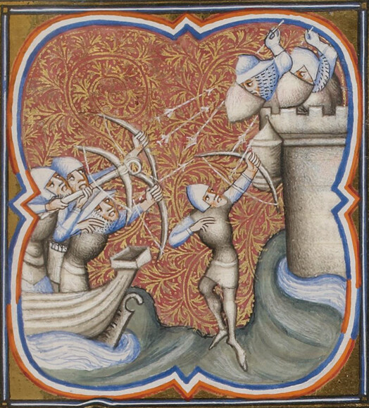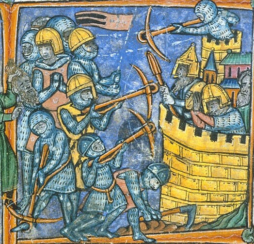 Prise de Damiette en 1249, selon une représentation postérieure du XIVe siècle. L'importance des arbalétriers et archers est restituée.