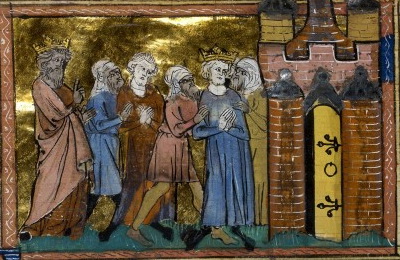 Louis IX en pèlerinage à Nazareth, Chroniques de Saint-Denis, 1332-1350, BL, Royal 16 G VI. Public domain, via Wikimedia Commons
